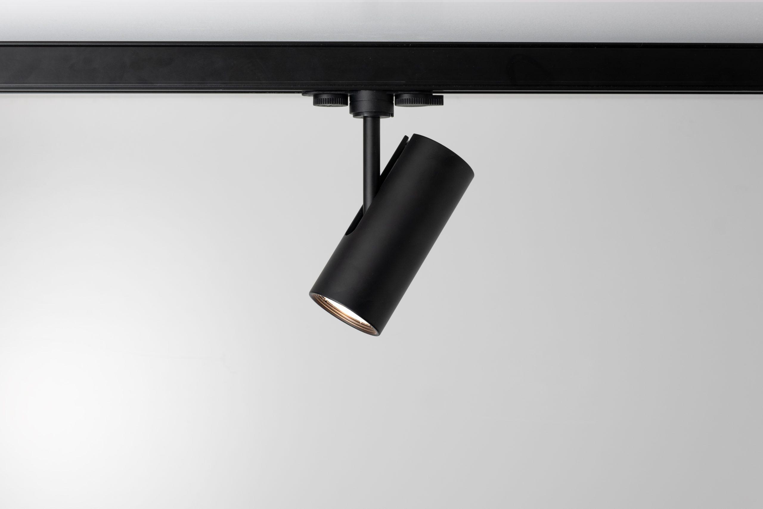 Proiettore LED da binario, bilanciato, direzionabile con inclinazione max. 90°. Realizzato in Alluminio e parabole in policarbonato con schermo antiglare. Disponibile anche nella versione a plafone.