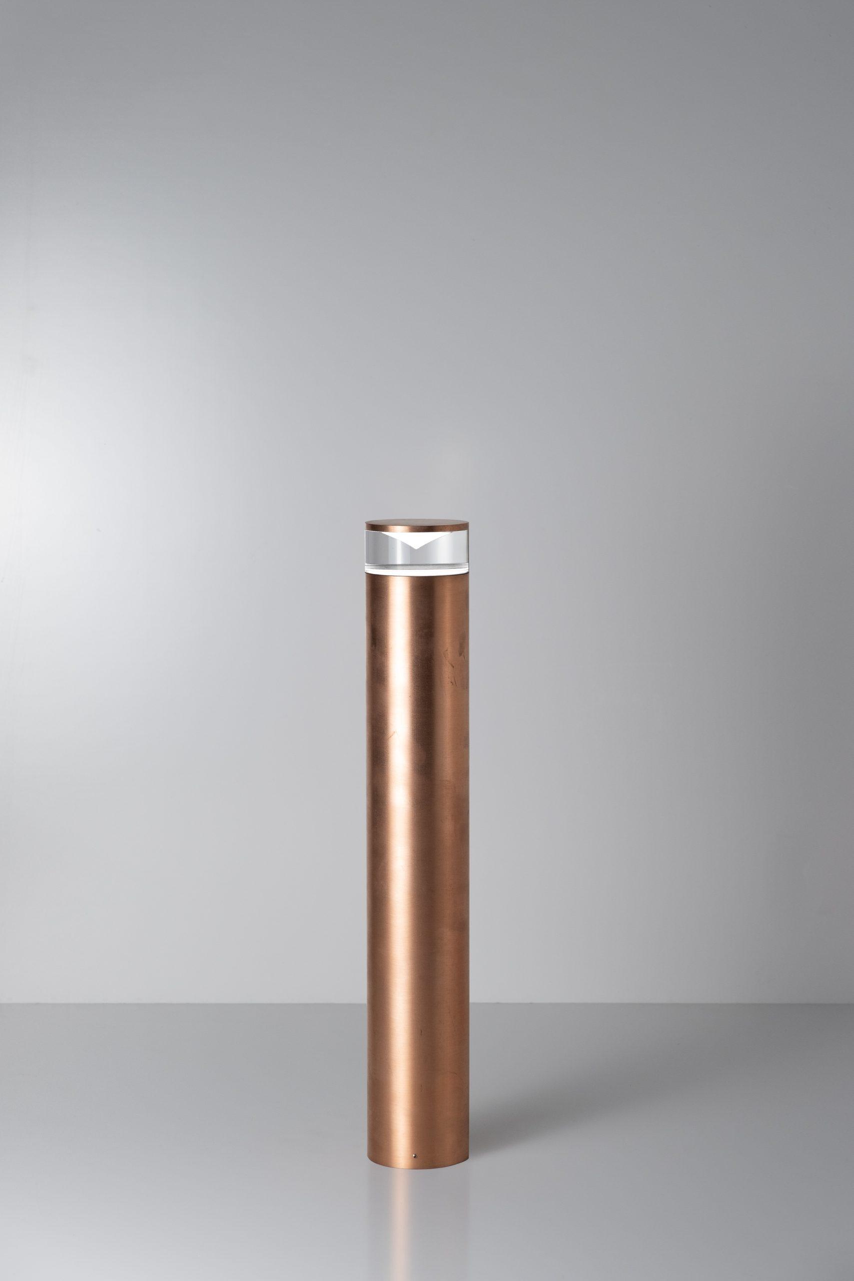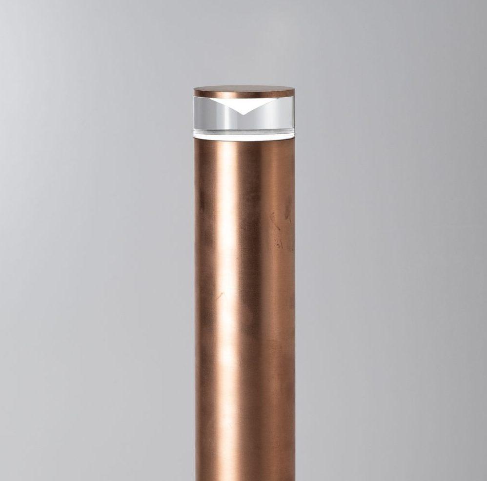 Apparecchio LED per esterni, con fascio luminoso radiale 360° o unidirezionale 180°, realizzato in alluminio anodizzato o rame ad ossidazione naturale e ottica lavorata su monoblocco di metacrilato.